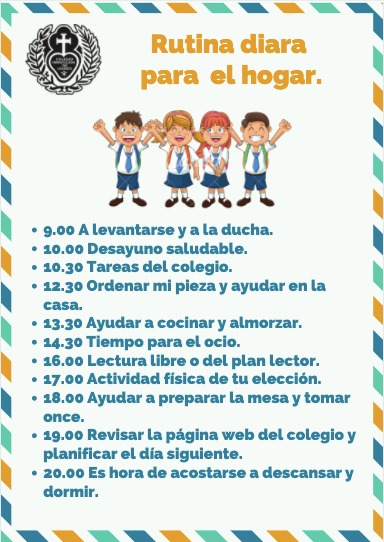 Como Departamento de Orientación, queremos colaborar en la contención del estado emocional de nuestros y nuestras estudiantes. Para ello ponemos a disposición de la comunidad educativa una rutina que ayude a organizarse. Esta es sólo una propuesta la cual pueden implementar y modificar según sus propios hábitos.